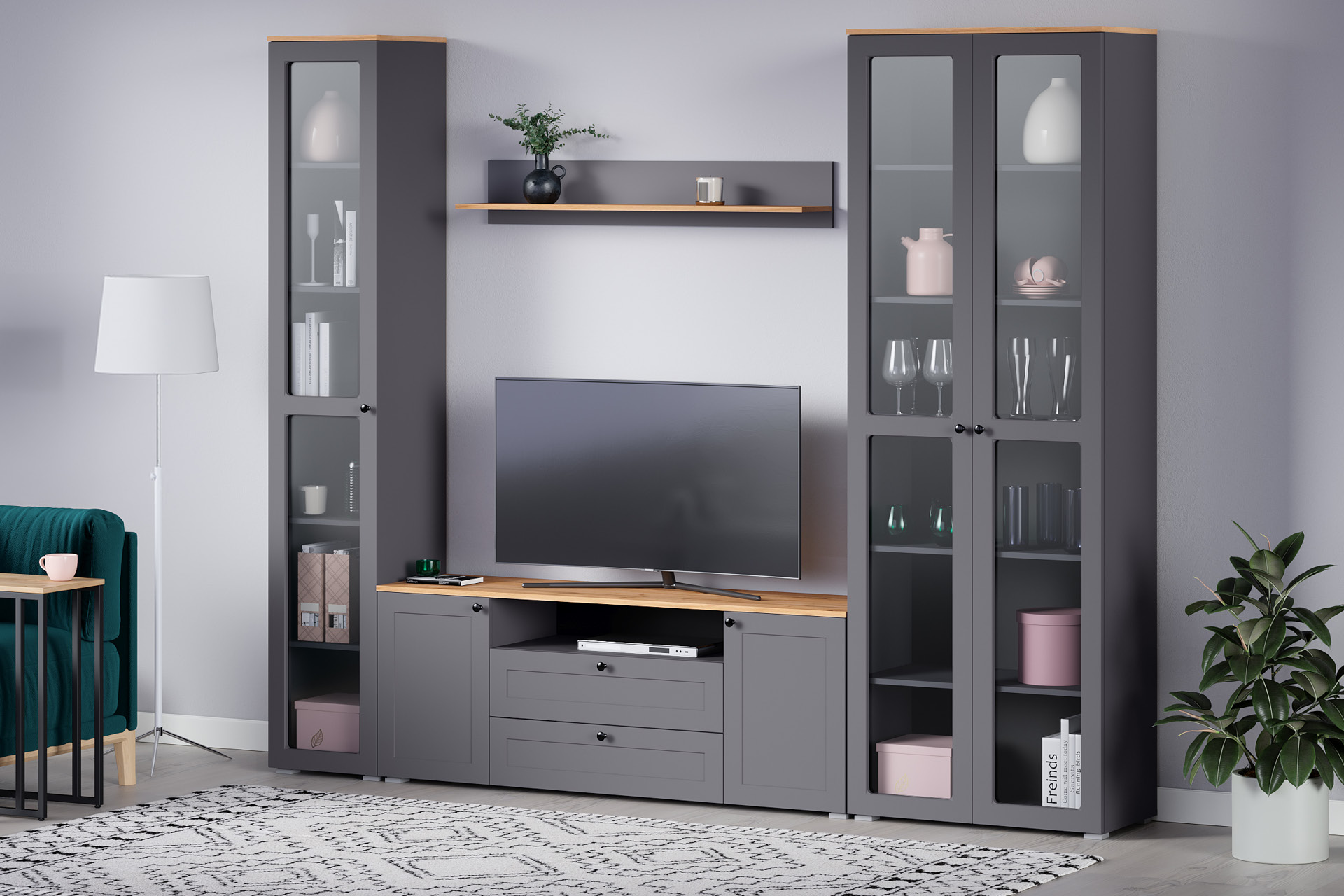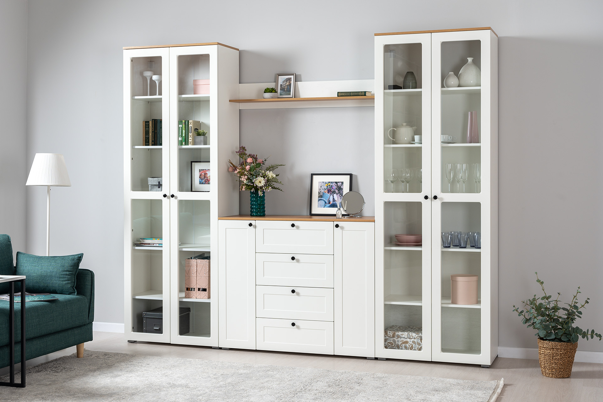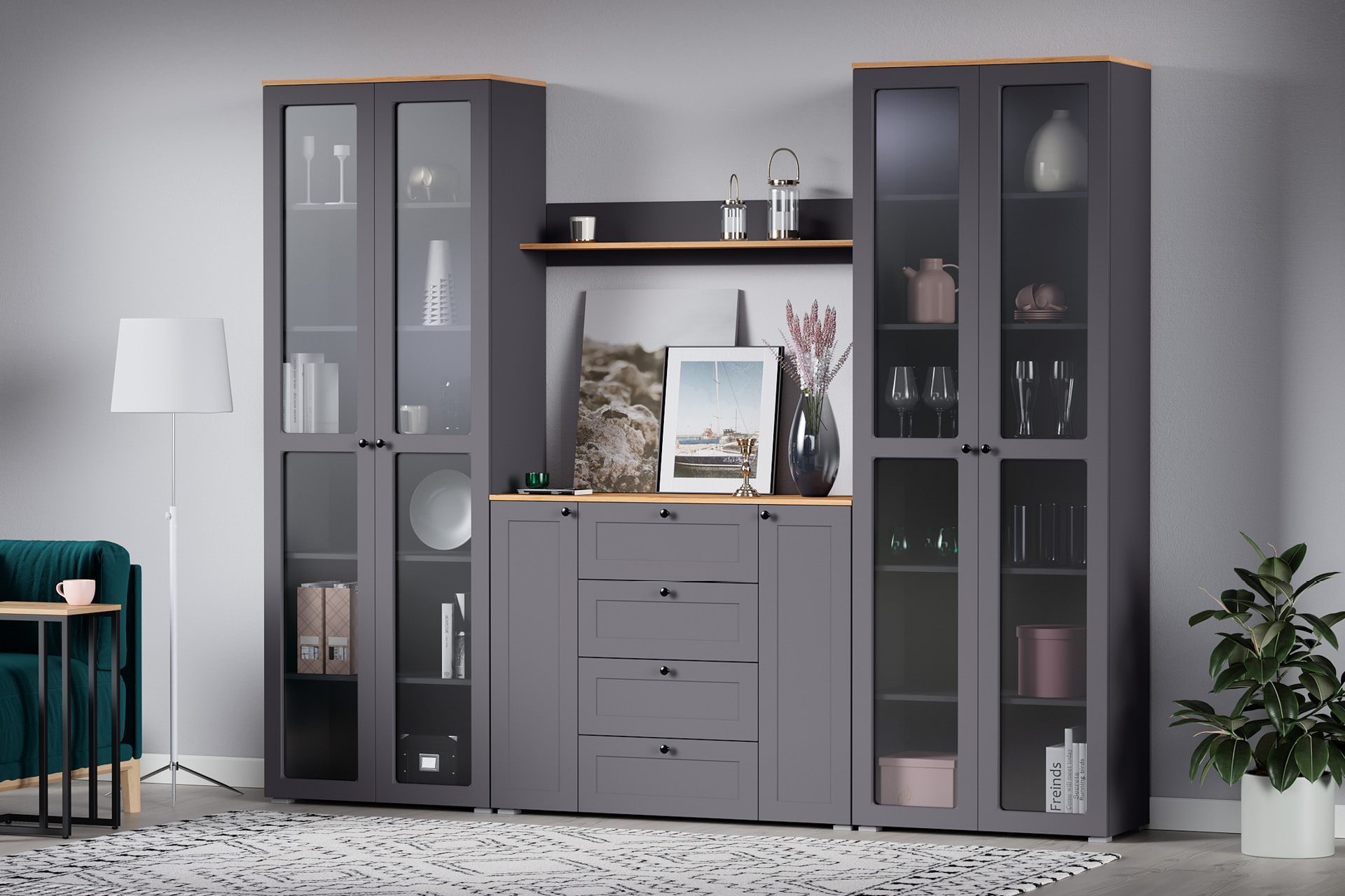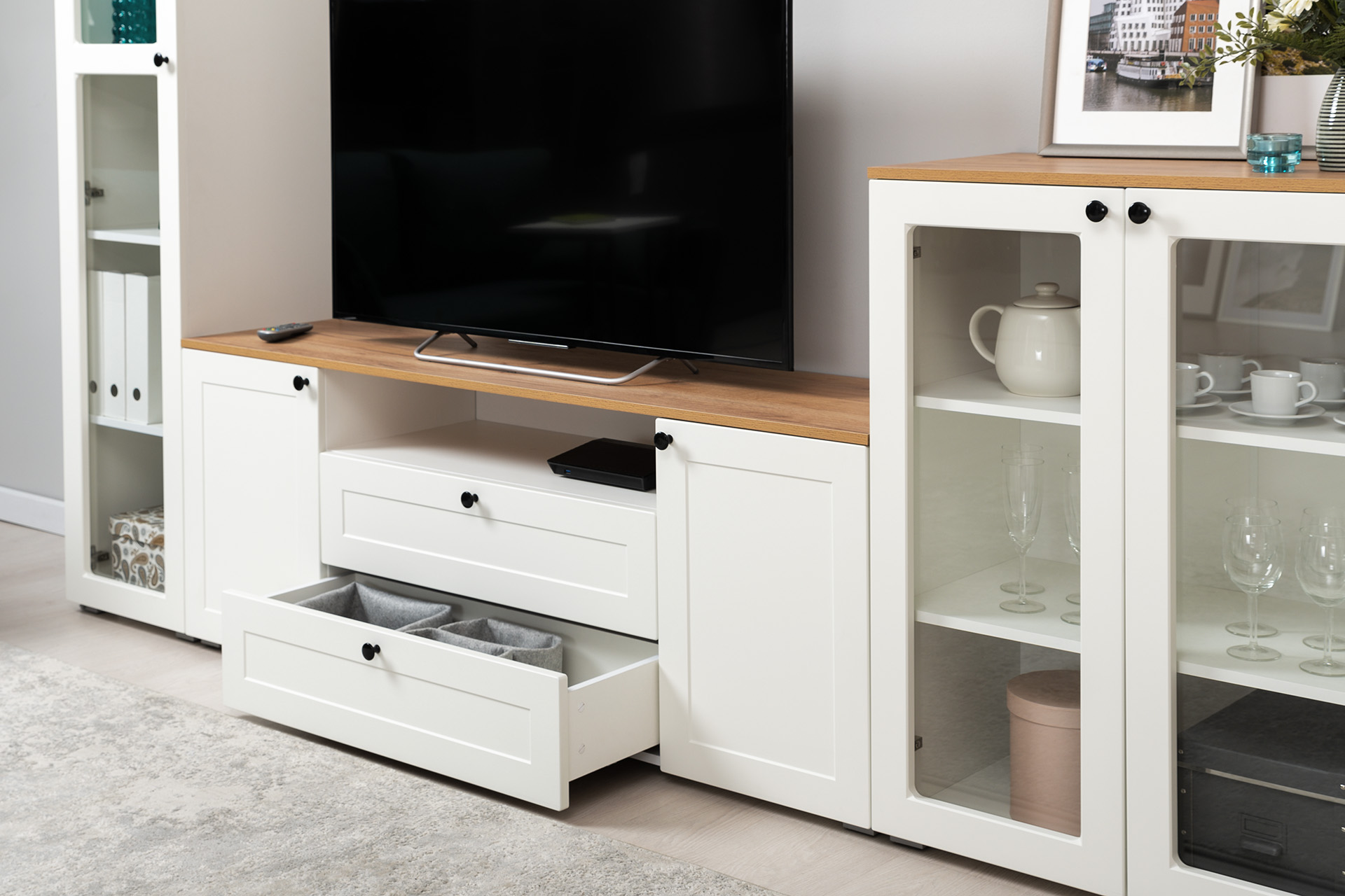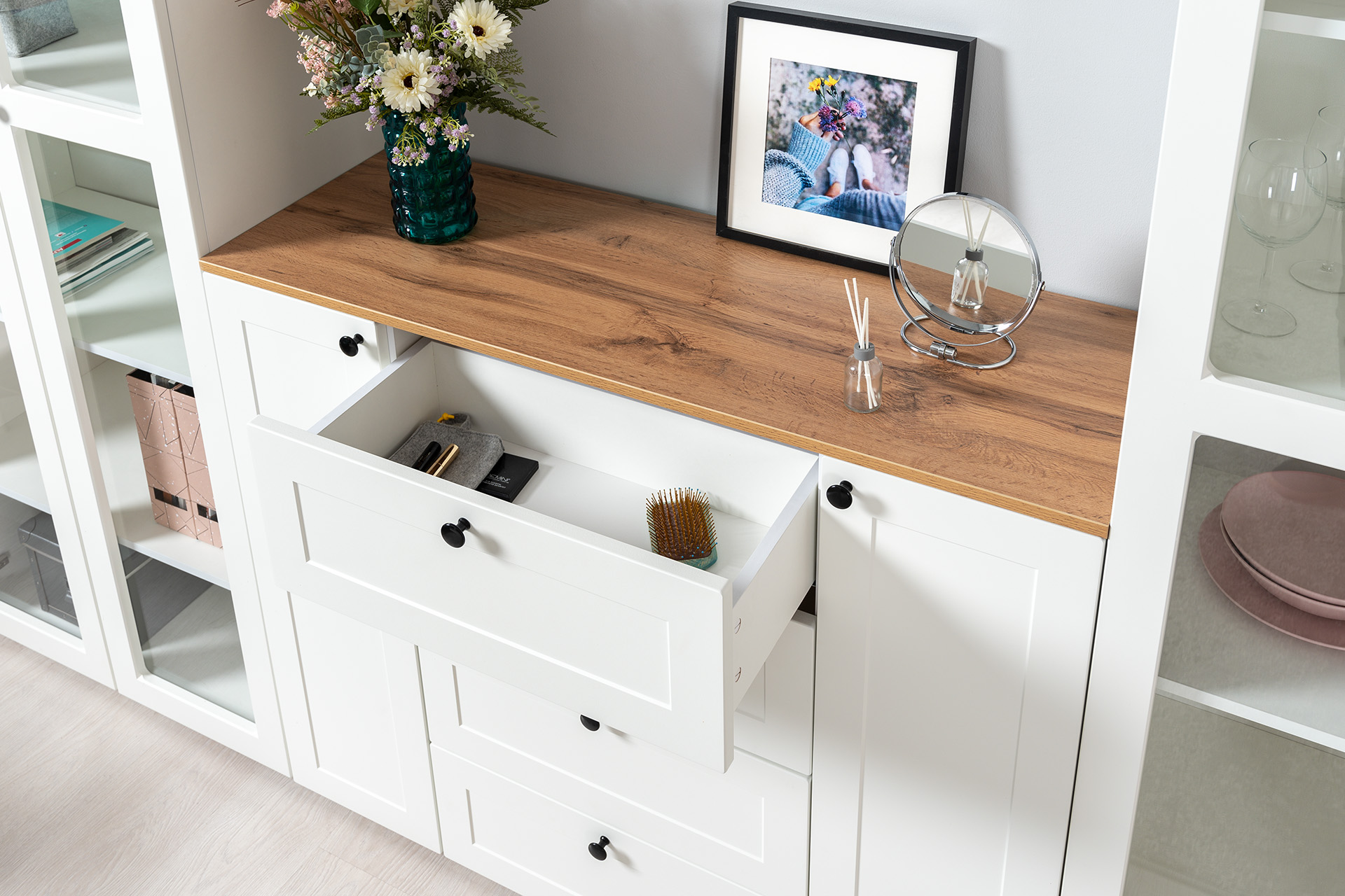 Доступна в двух цветовых решениях – белый/графит в сочетании с теплым древесным декором.