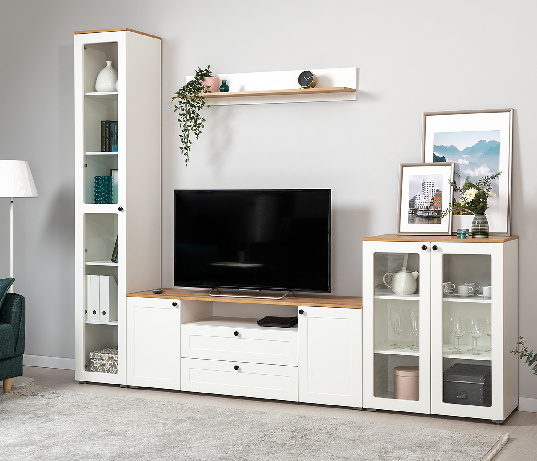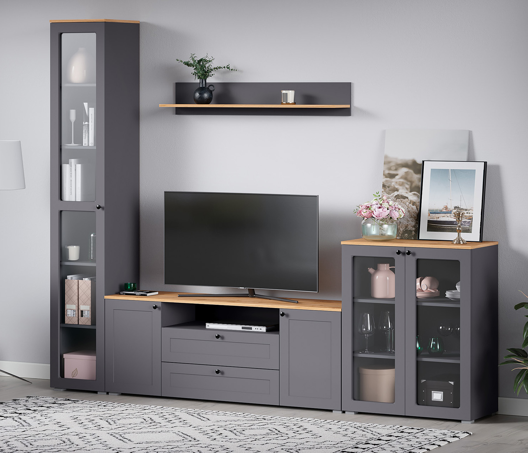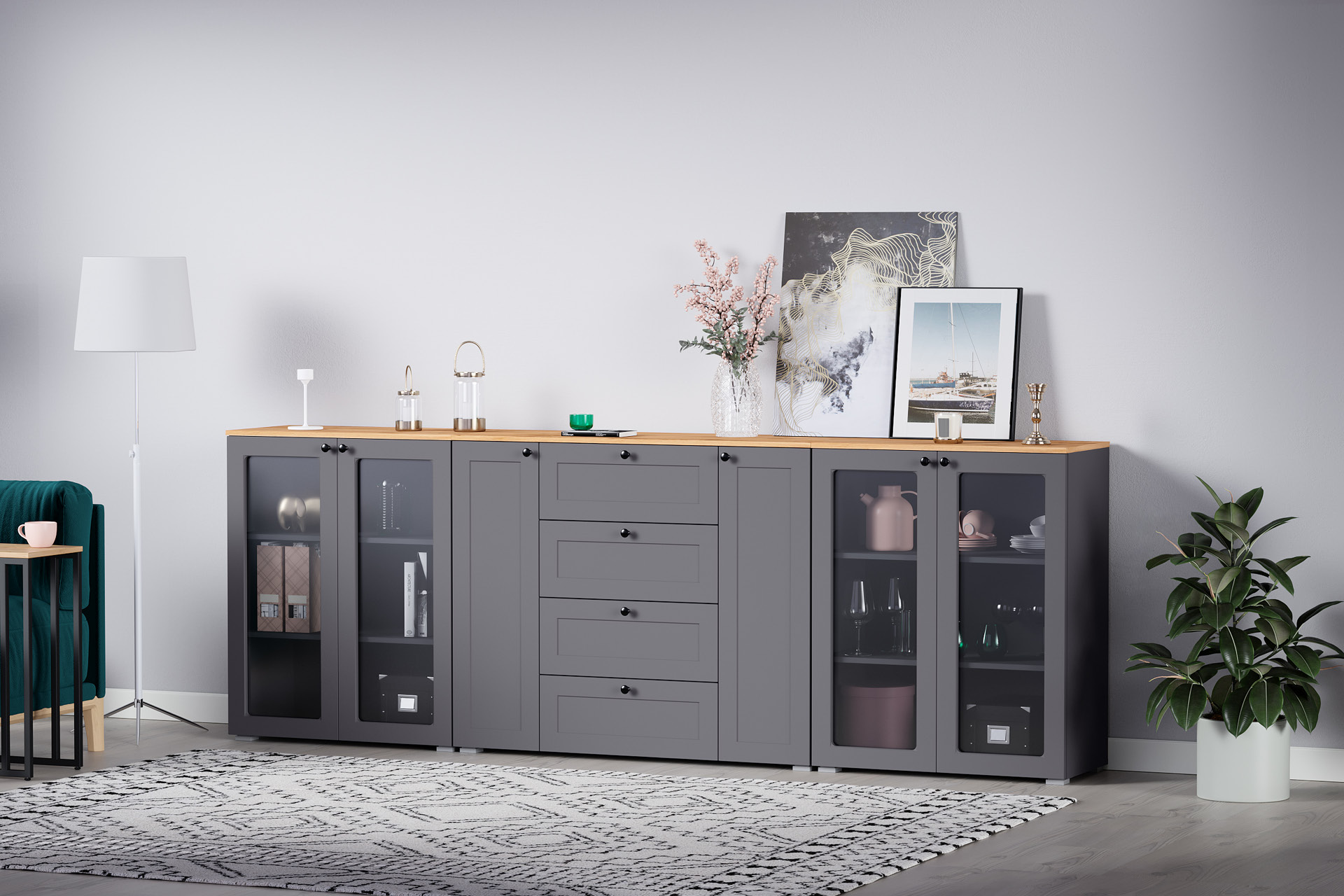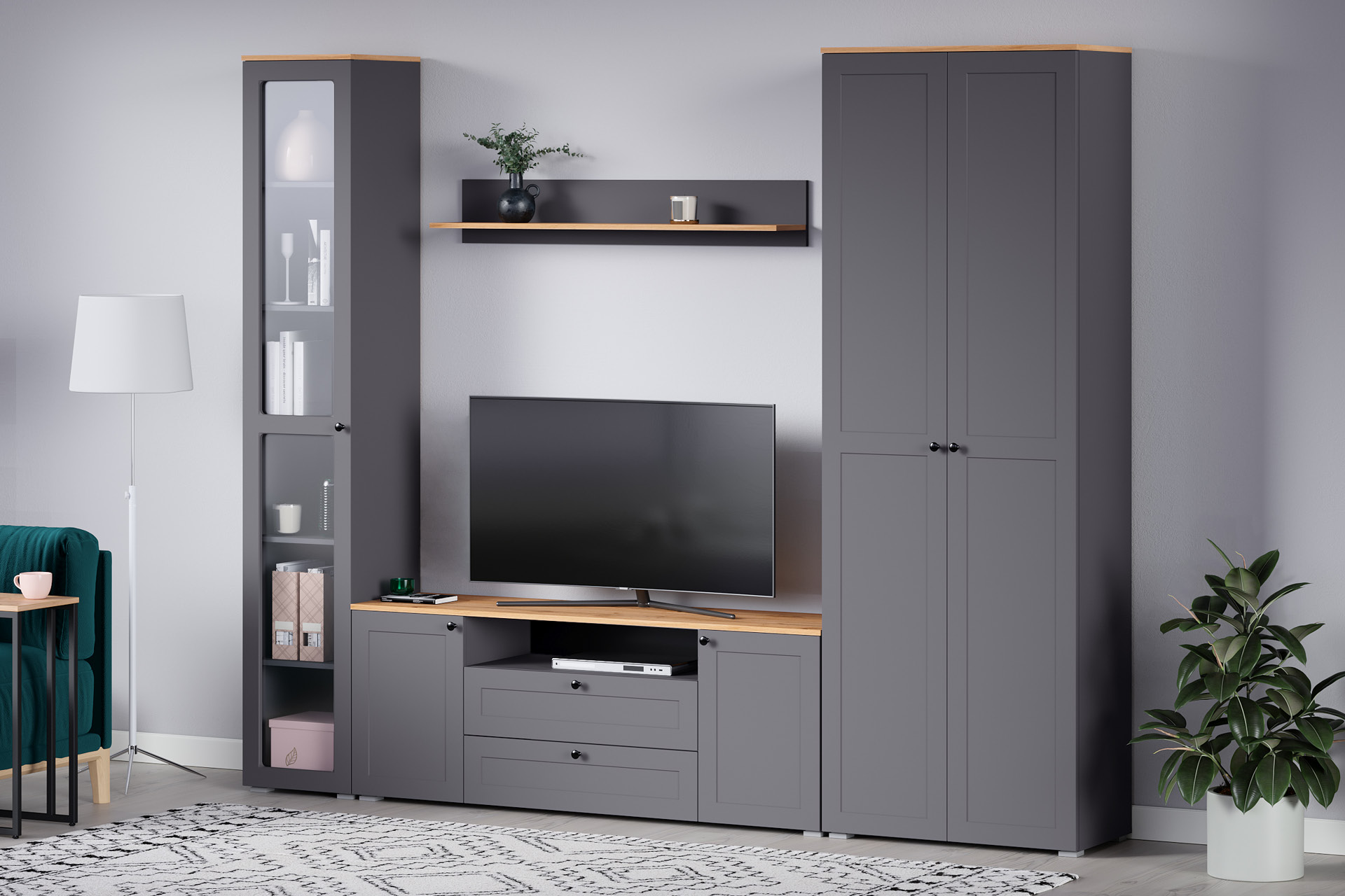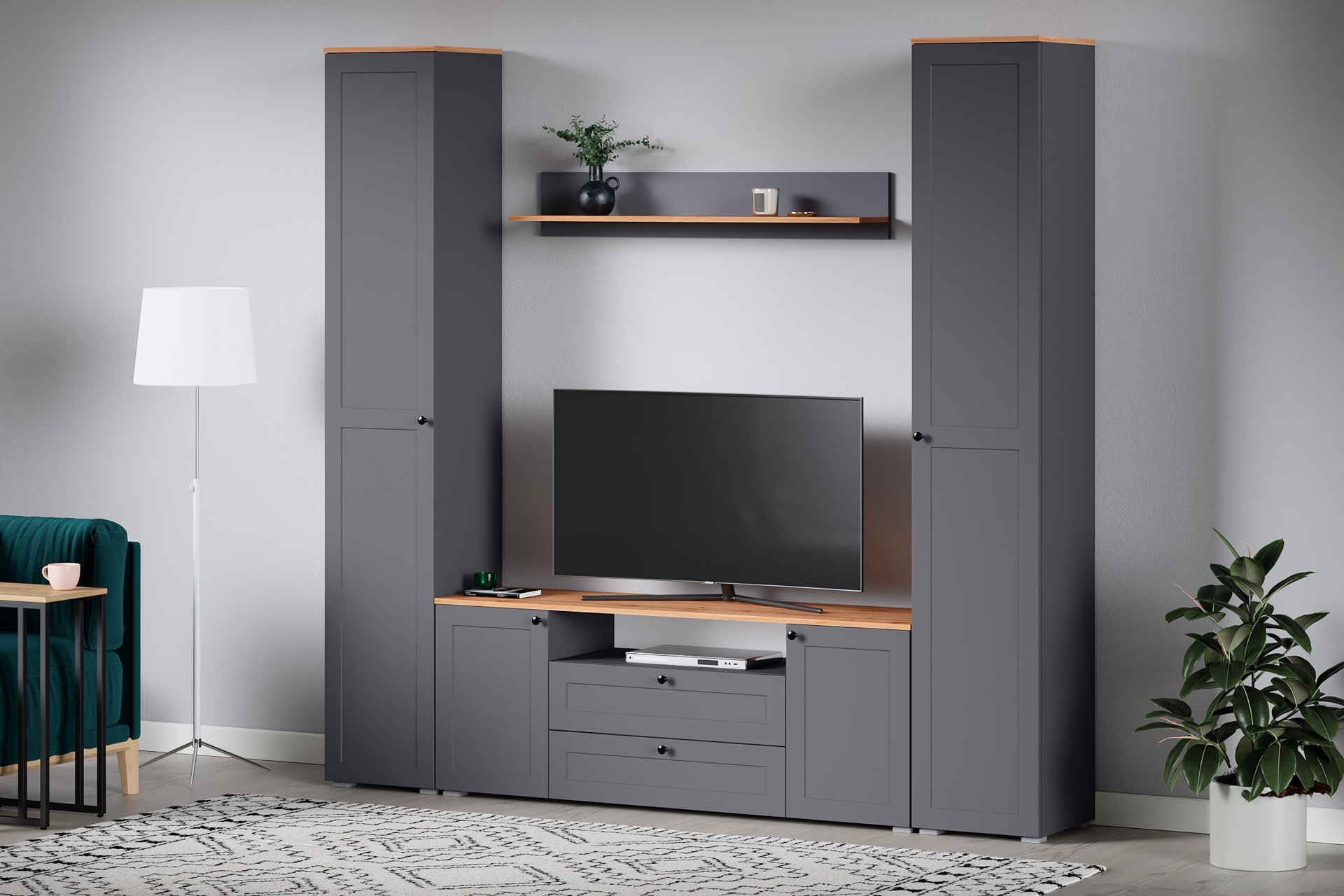 Доступна в двух цветовых решениях – белый/графит в сочетании с теплым древесным декором.