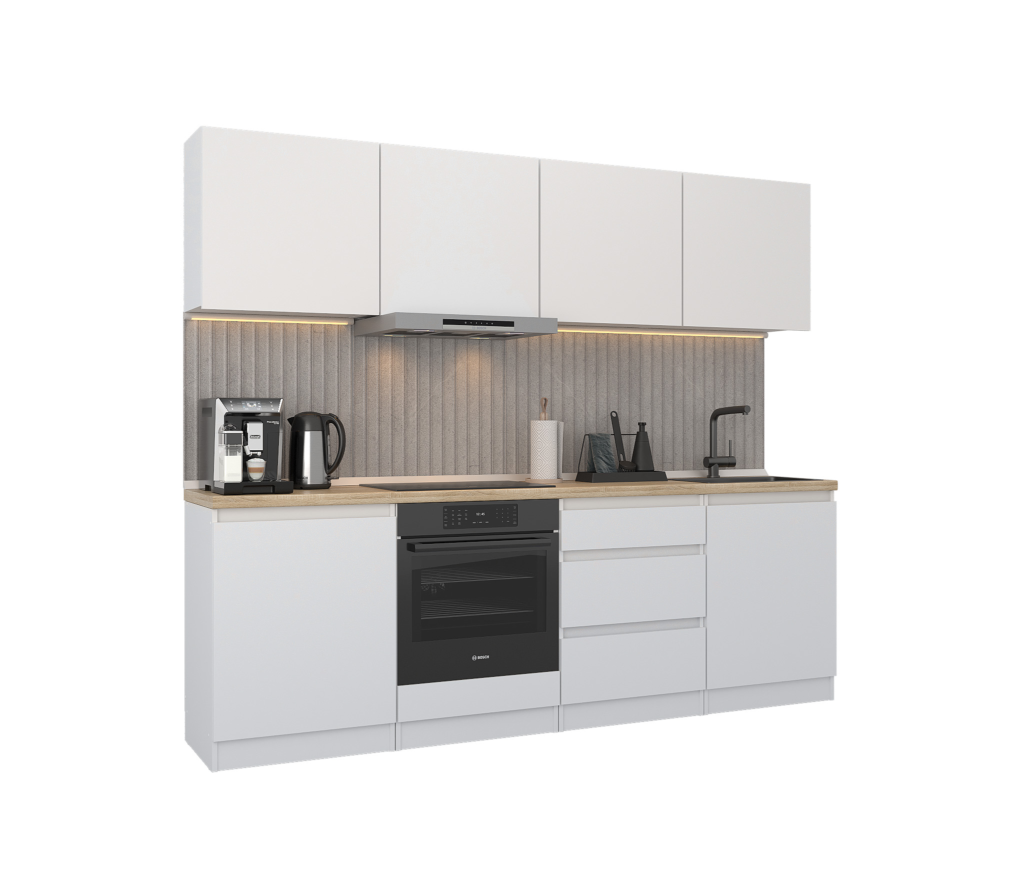 Кухня Леон сочетает в себе функциональность, стиль и доступность, и является прекрасным выбором для тех, кто ищет компактное и удобное решение для своей кухни. Кухонный гарнитур Леон идеально подходит для помещений с ограниченным пространством. Корпус и фасады выполнены из белого ЛДСП. Фасады столов и шкафов не имеют лицевой фурнитуры и открываются захватом за тыльный край фасада. Леон смотрится современно, а отсутствие ручек упрощает уход за поверхностью.