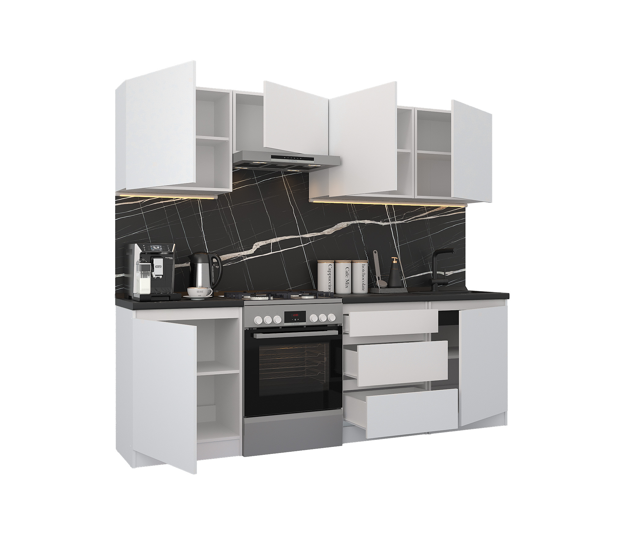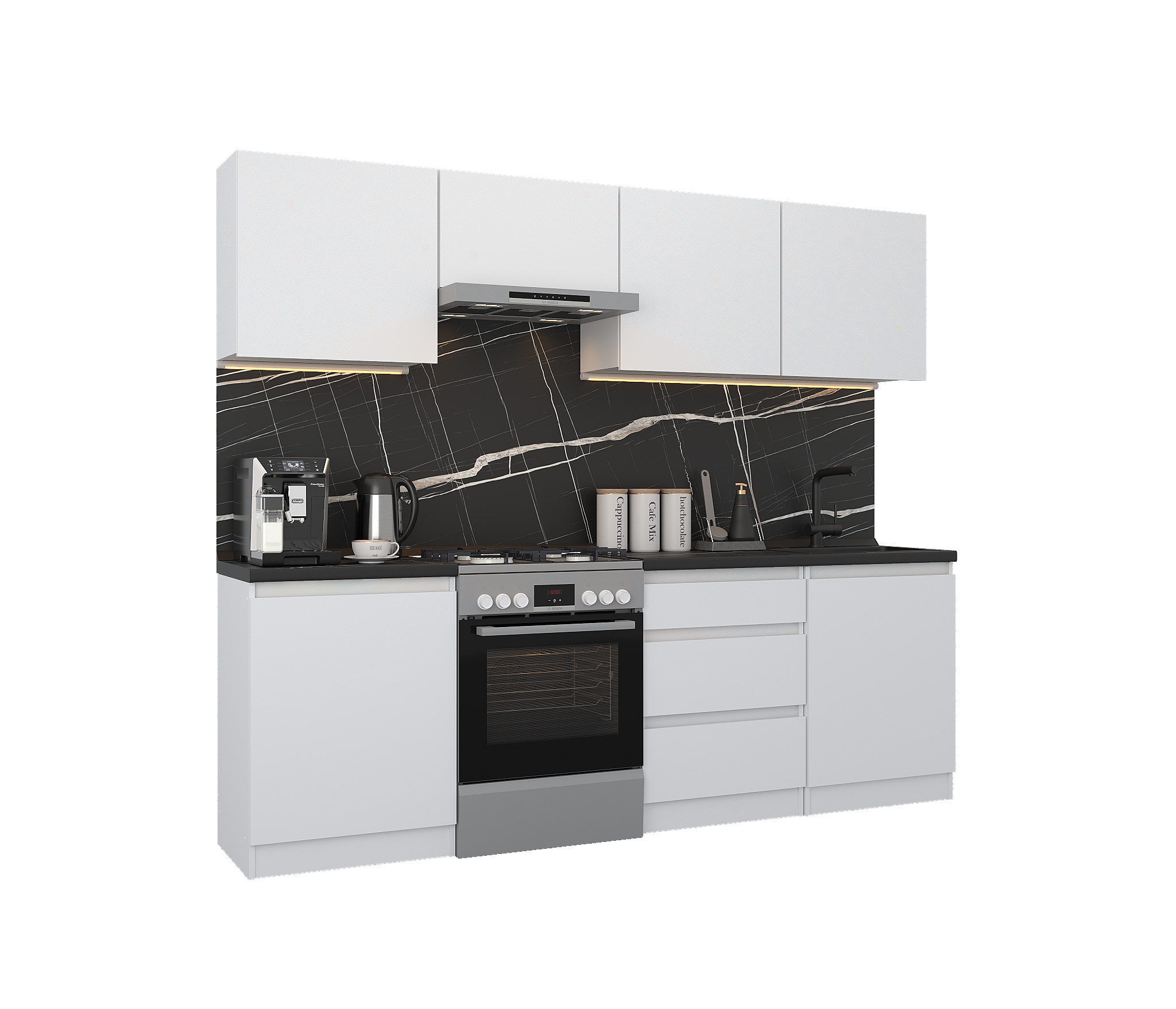 Кухня Леон сочетает в себе функциональность, стиль и доступность, и является прекрасным выбором для тех, кто ищет компактное и удобное решение для своей кухни. Кухонный гарнитур Леон идеально подходит для помещений с ограниченным пространством. Корпус и фасады выполнены из белого ЛДСП. Фасады столов и шкафов не имеют лицевой фурнитуры и открываются захватом за тыльный край фасада. Леон смотрится современно, а отсутствие ручек упрощает уход за поверхностью.