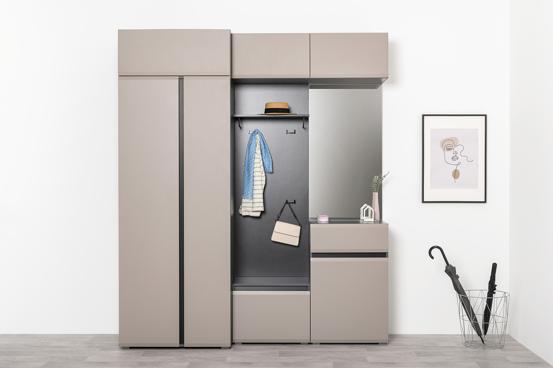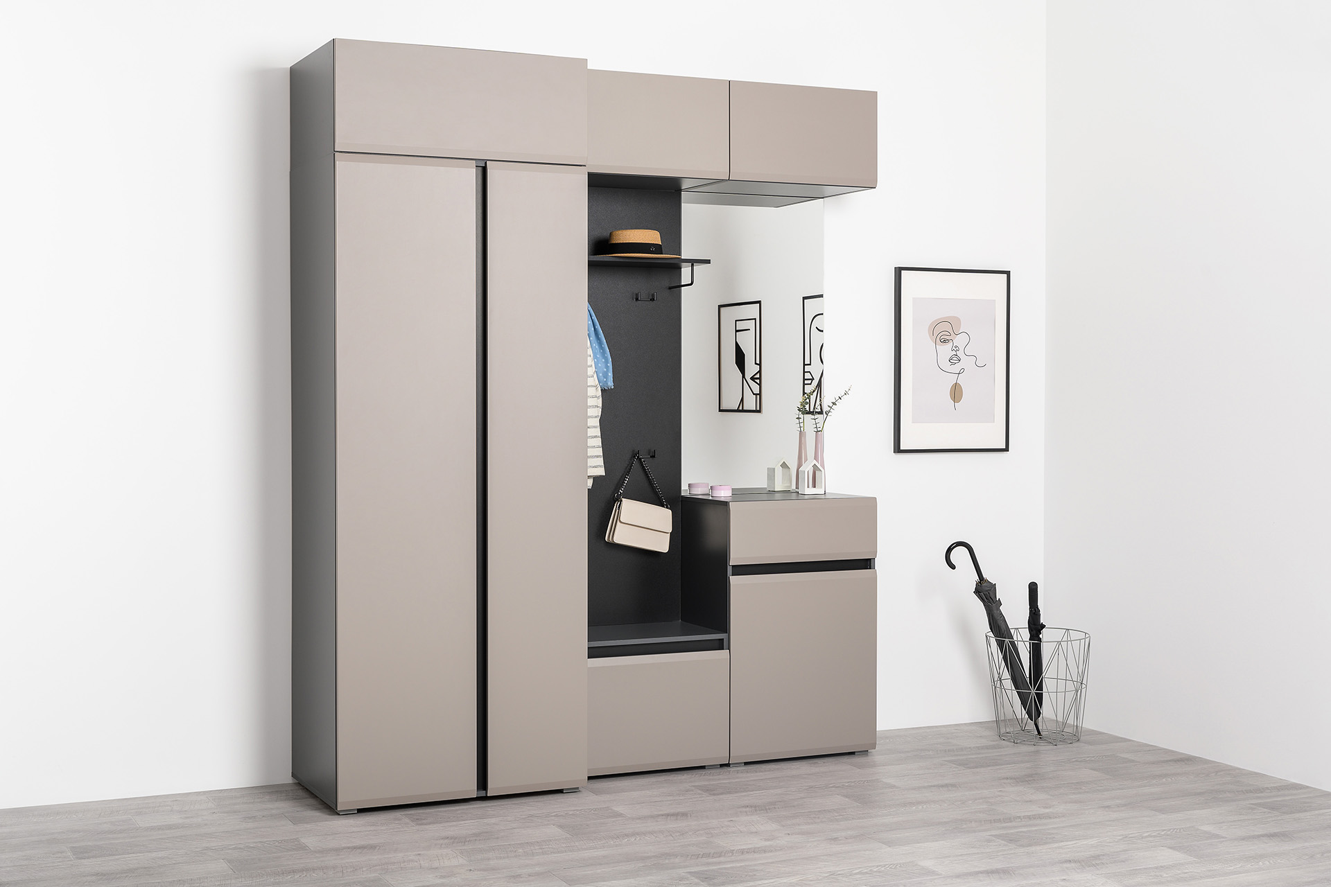 Сидней – стильная и функциональная прихожая, которая масштабируется под любую площадь помещения и высоту потолков. Минималистичные фасады в трендовом цвете без лицевой фурнитуры открываются за край либо нажатием (push-to-open). Большой выбор модулей: высота шкафов от 2050 до 2400 мм и полноразмерная глубина позволит максимально использовать полезное пространство. Вместительная система для хранения одежды, обуви и хозяйственных принадлежностей. Цветовое решение: ЛМДФ 16 мм Веллюто Капучино; ЛДСП 16 мм Антрацит.