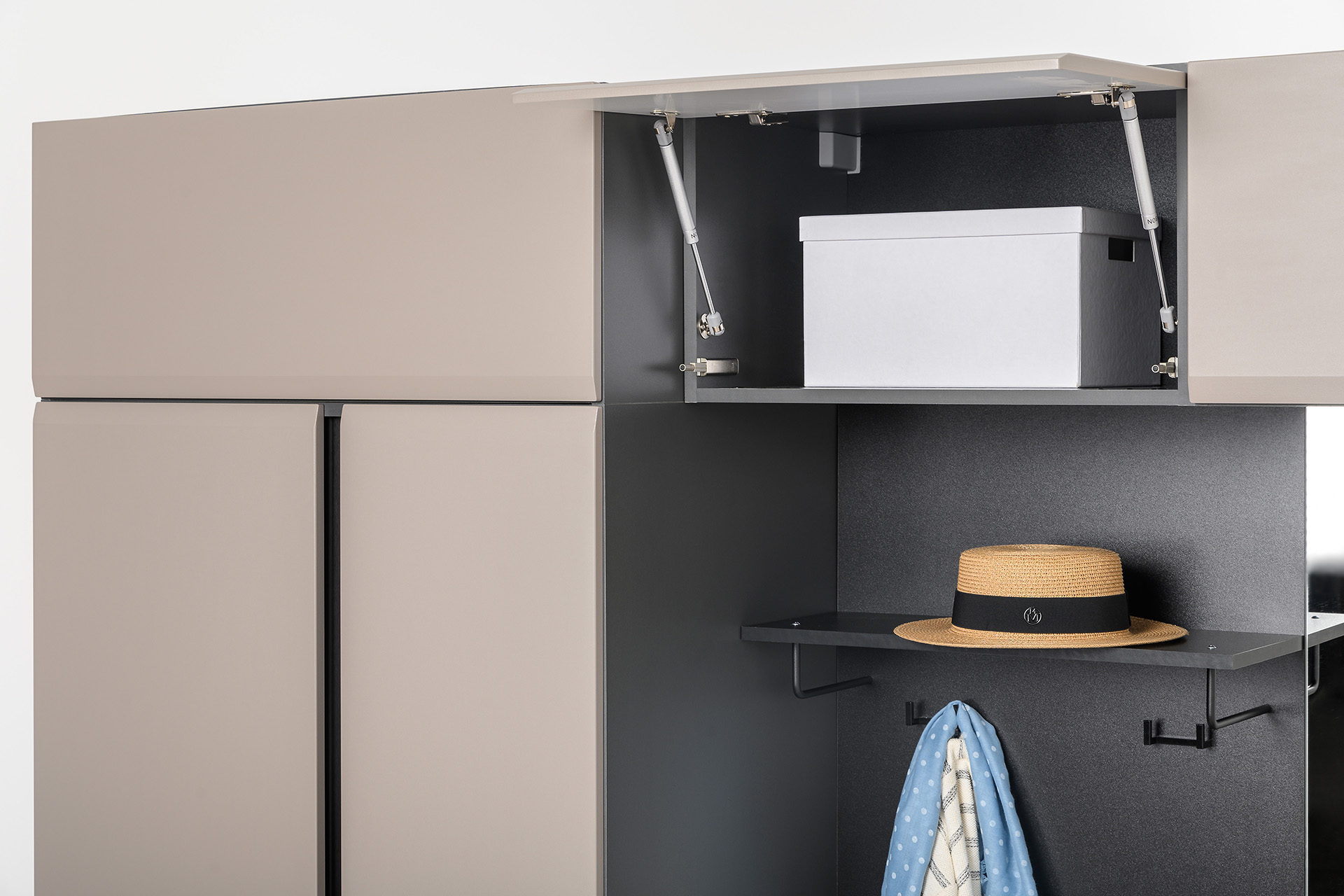 Фасад оборудован газ-лифтом для поддержания в открытом положении, а также плавного открытия.
