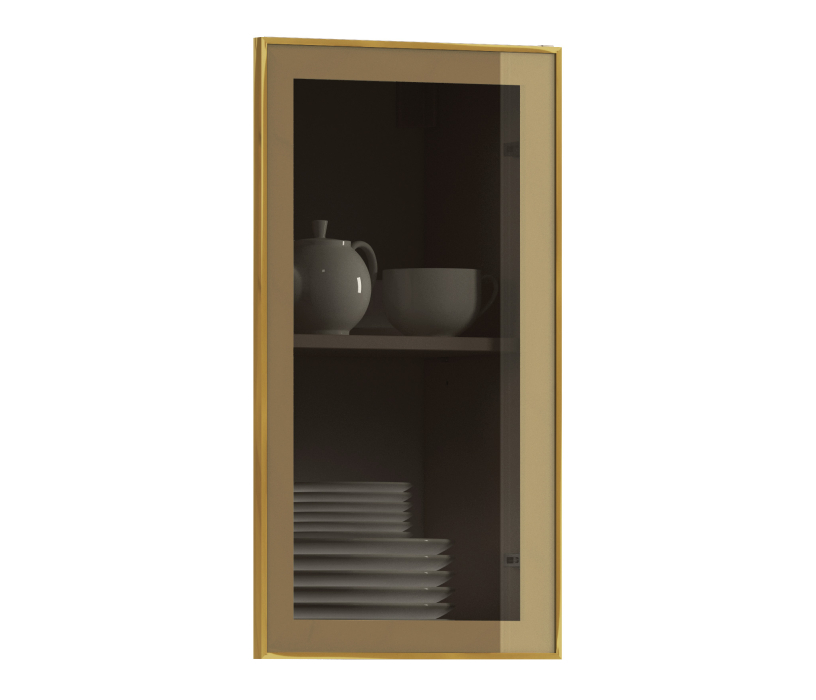 Фасад кухни выполнен из алюминиевой рамки золотого цвета, которая придаёт интерьеру элегантность и современный стиль. Бронзовое стекло добавляет нотку роскоши и глубины, создавая эффектный контраст с рамкой.