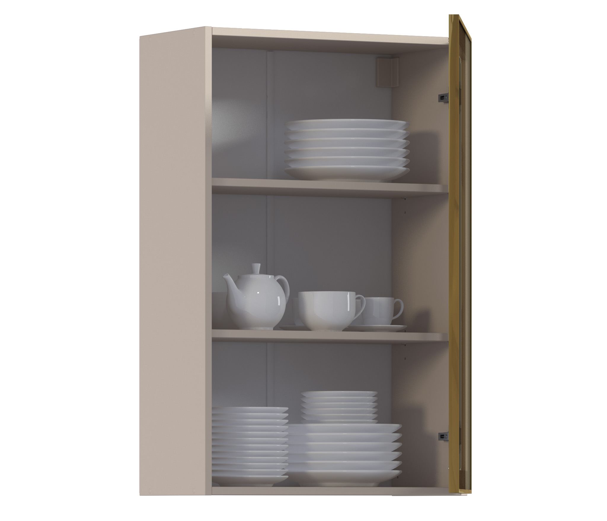 Комплект включает в себя корпус кухонной полки (песочного цвета) с необходимой фурнитурой, фасад из алюминиевой рамки золотого цвета и бронзового стекла, а также ручку, соответствующую цвету рамки фасада.