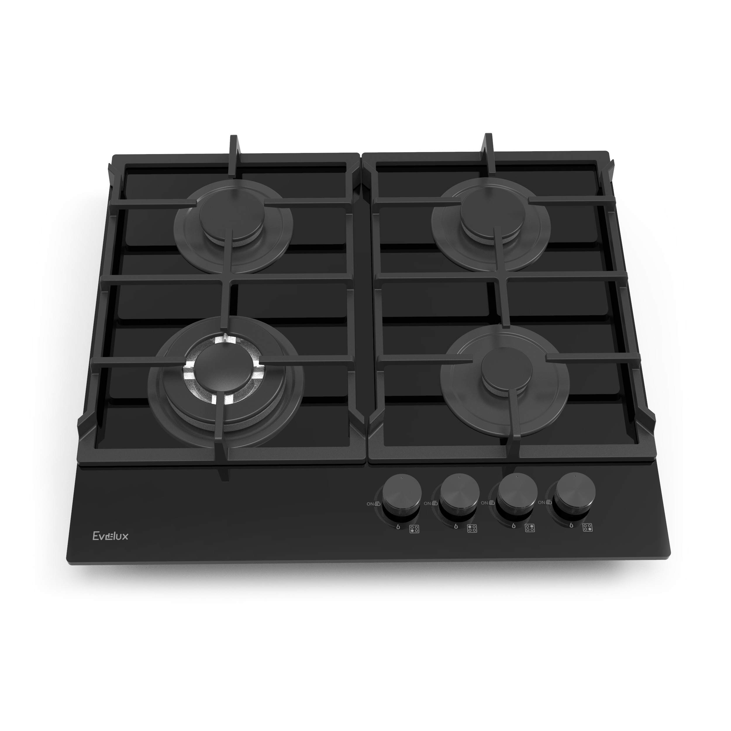 Варочная панель газовая, 60 см, 4 конфорки: экономичная конфорка (1 кВт), 2 стандартных конфорки (2х1,75 кВт), Вок конфорка (3,3 кВт), газ-контроль, электроподжиг, черное высокопрочное закаленное стекло, чугунные решетки, поворотные переключатели, комплект форсунок-переходников на балонный газ, 600х510х110 мм.
