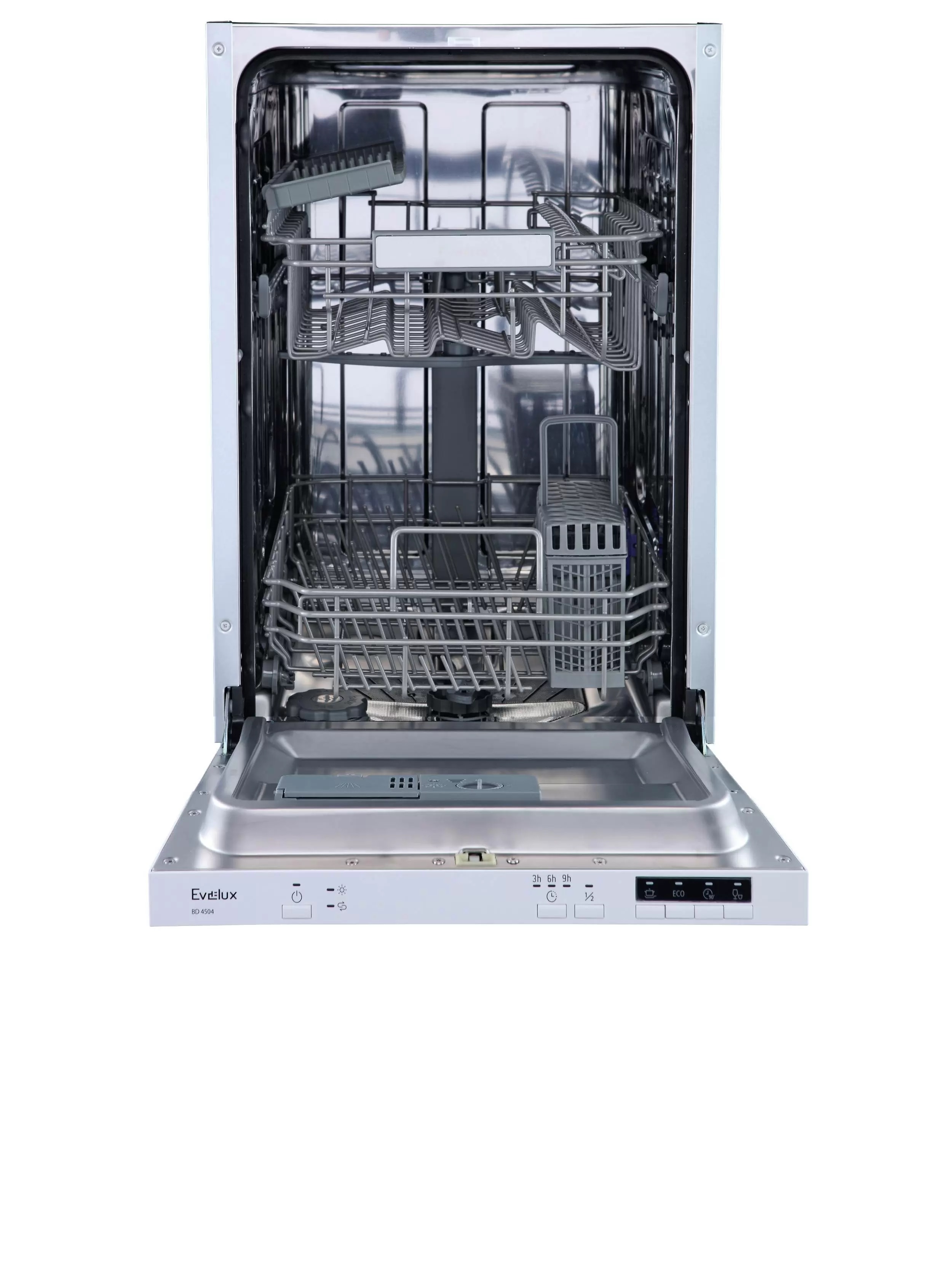 Встраиваемая посудомоечная машина узкая, 45 см, 4 программы, 9 комплектов, LED индикация, таймер 3-6-9, А+АА, 49 дБ уровень шума, регулировка корзины по высоте, 9л потребление воды, система защиты от протечек, внутренняя поверхность из нержавеющей стали, 448х550х815 мм.
