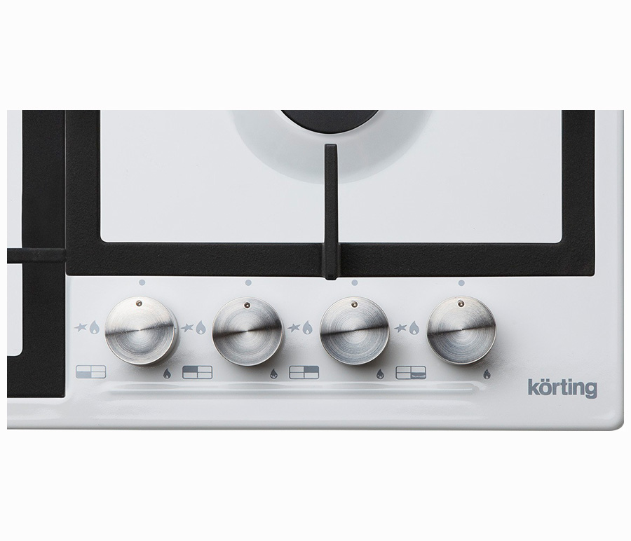Газовая варочная панель 60см, 4 высокоэффективные конфорки, WOK- сверхмощная конфорка с тройным рядом пламени, автоматический электроподжиг, газ-контроль каждой конфорки, передние металлические переключатели, чугунные решетки, цвет- белый
