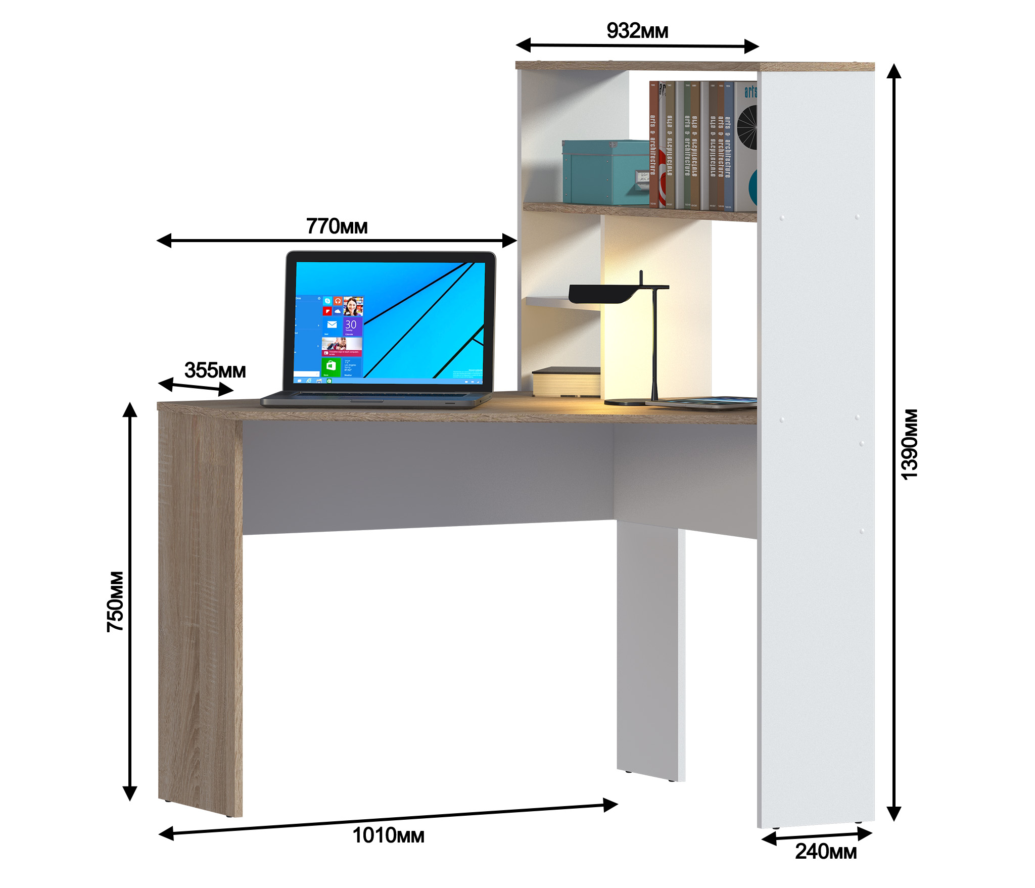Стол Мамбо СБ-2986 – комфортное рабочее место. Благодаря продуманной конструкции и легкому минималистичному дизайну, стол не создает ощущение громоздкости в помещении. Габаритные размеры стола Мамбо – ширина 101 см, высота 138 см и глубина 93 см. Привычных для письменных столов тумб здесь нет, но есть вместительное отделение с полками над рабочей поверхностью. Конструкция позволяет размещать стол Мамбо в углу. Стол произведен из качественного современного ЛДСП, устойчивого к влаге. Внешняя отделка комбинированная. Корпус стола, рабочая поверхность и поверхность полок выполнены в цвете «Дуб Сонома», а торцевые поверхности в белом цвете.