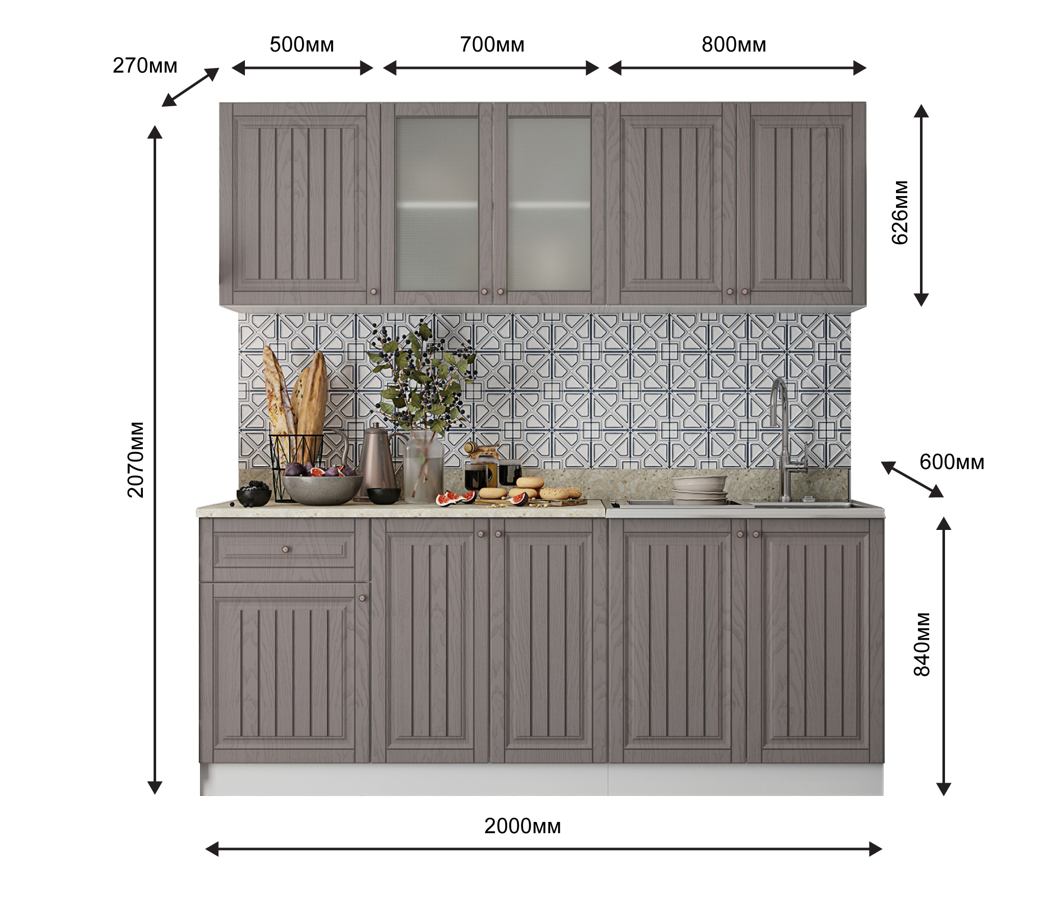 два верхних шкафа - общая ширина 1200мм (500мм , 700мм со стеклом) и на 800мм. Высота 626мм. Глубина 270 мм.