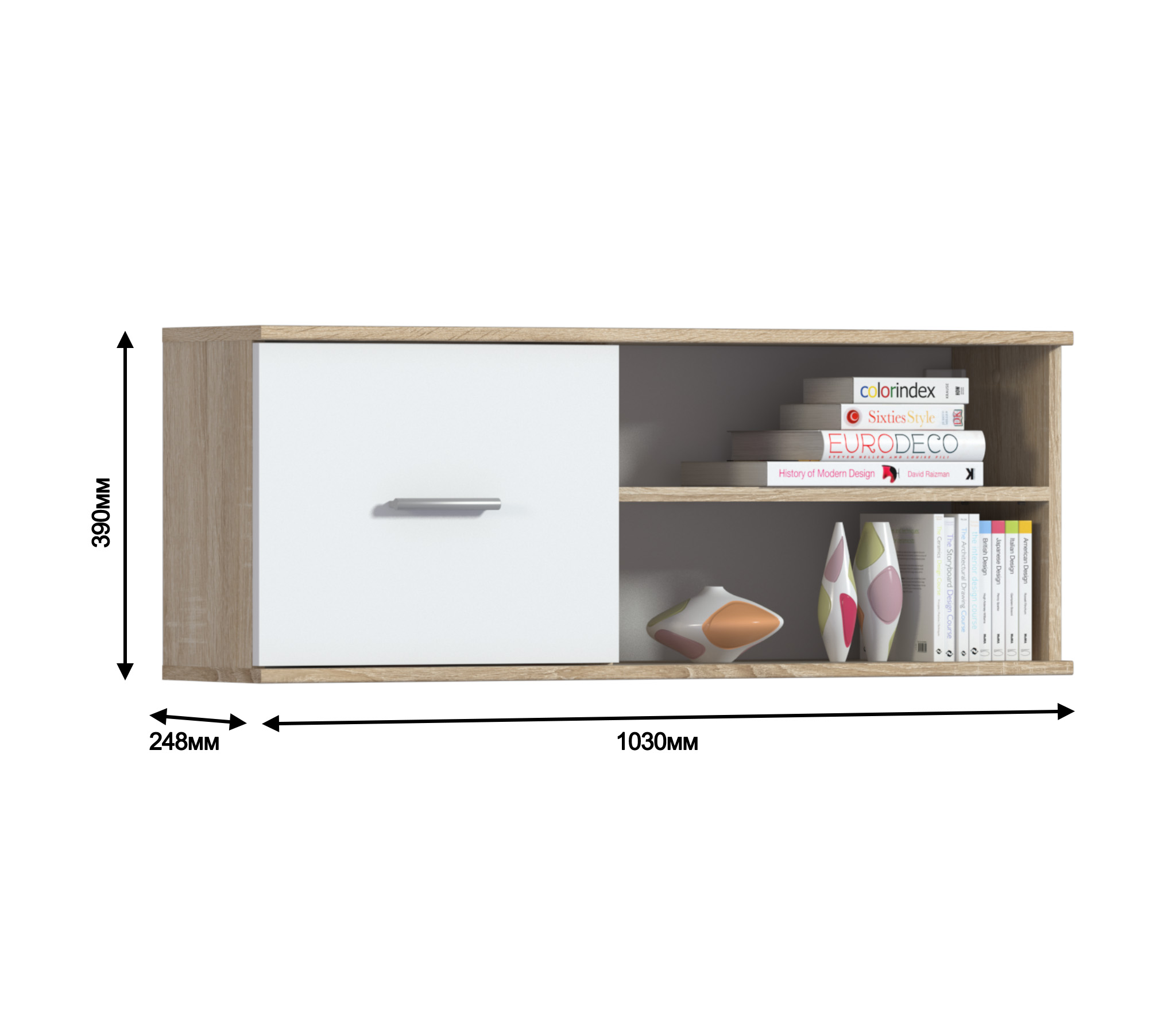 Габаритные размеры – ширина 103 см, высота 39 см и глубина 24 см. Полка состоит из двух открытых отделений, расположенных одно над другим и одного отделения за глухой дверцей.Выполнена полка из современного материала. .Полка крепится к стене при помощи дюбелей, которые входят в комплект.