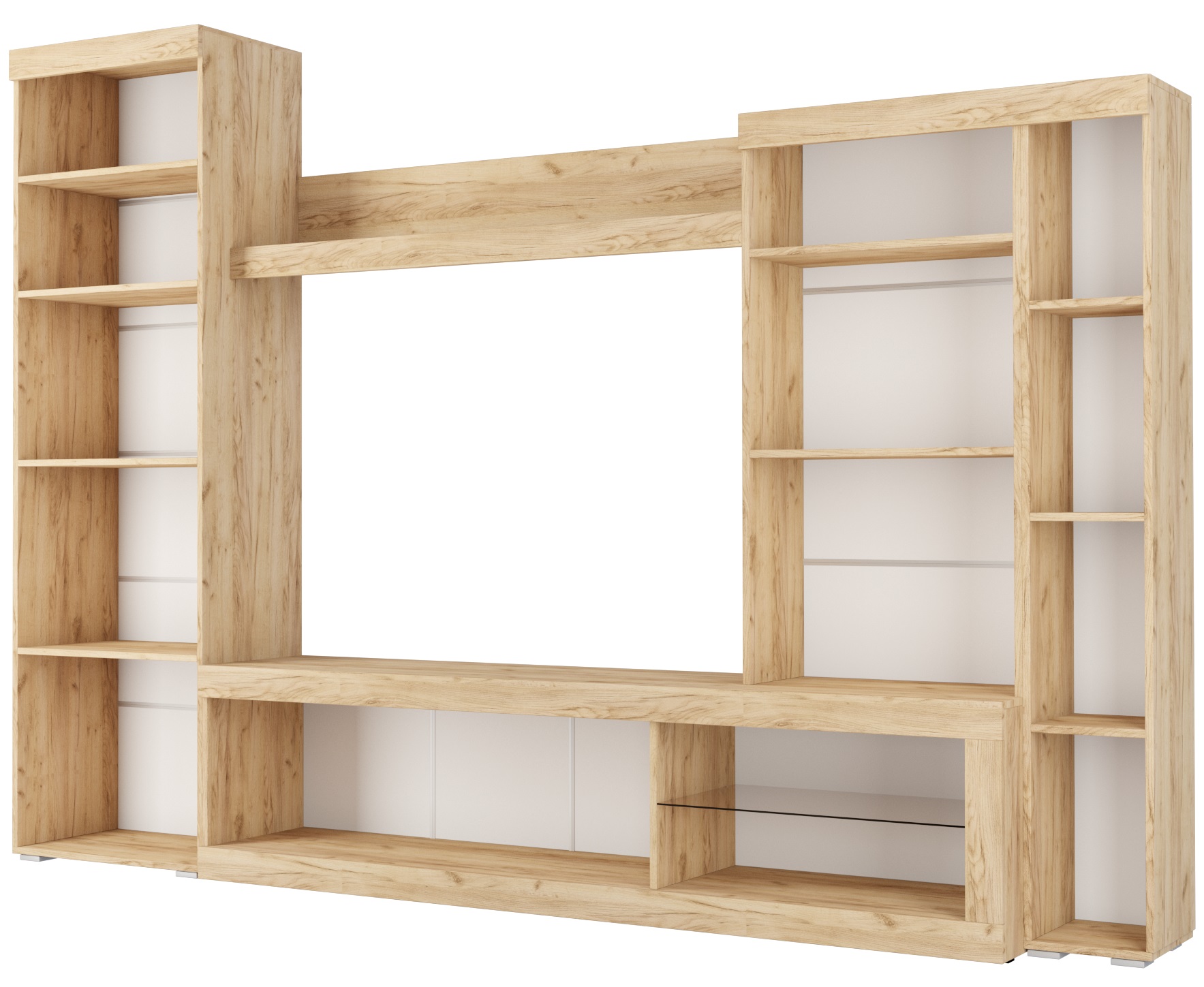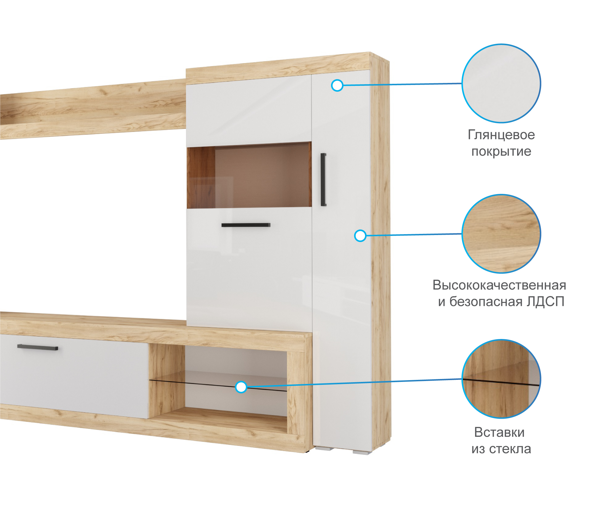 Гостиная Бастон является практичным вариантом для обустройства стильной комнаты. Открытые ниши и закрытые отделения предоставят достаточно места для размещения абсолютно всех вещей: посуды, книг и предметов декора. Для телевизора предназначена широкая зона по центру. Сочетание корпуса изделия в древесных оттенках и глянцевых фасадов со вставками из стекла делают мебель яркой и современной.
