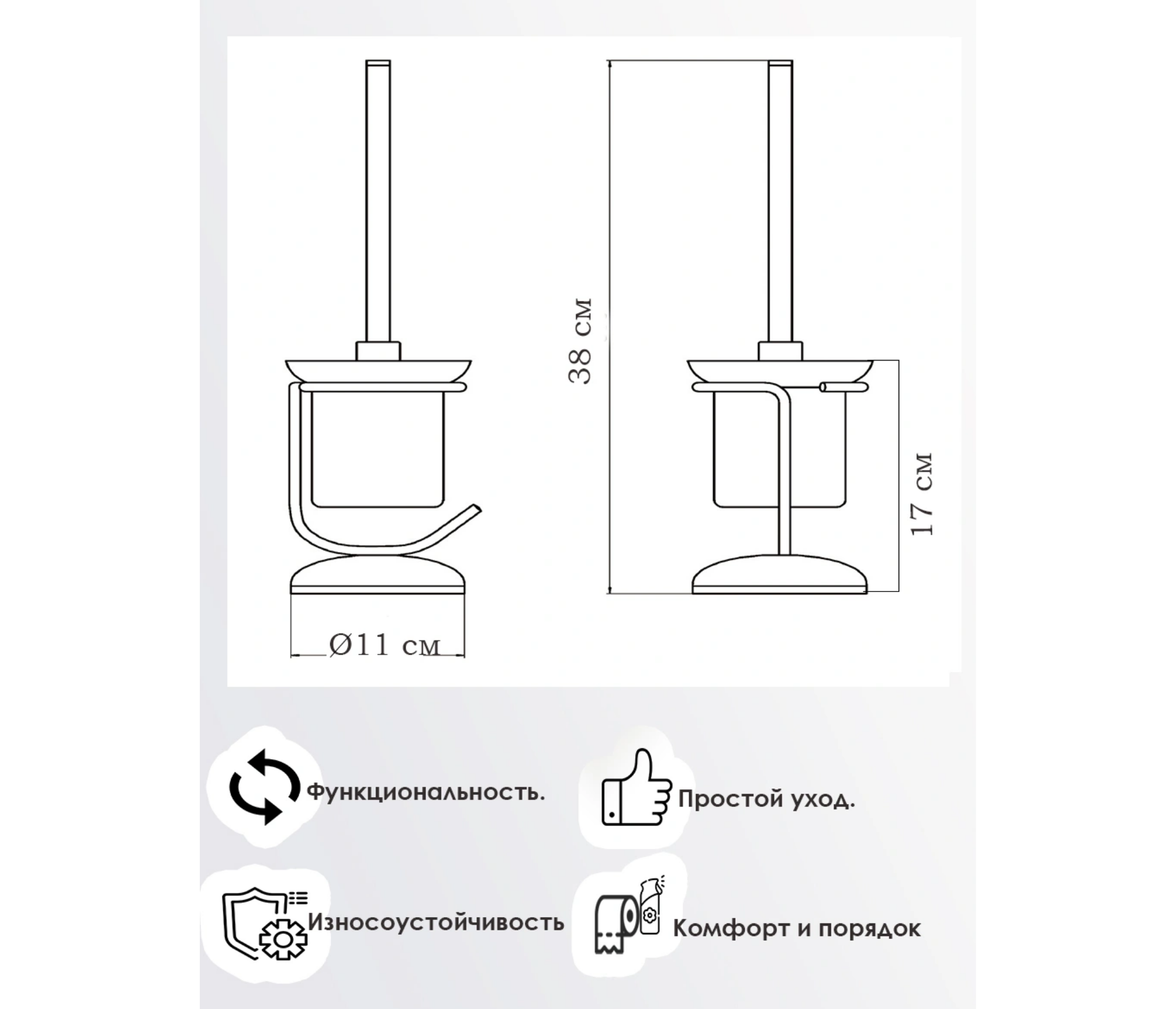 Ершик для унитаза незаменимый помощник для поддержания чистоты туалета. Аксессуар выполнен в классическом стиле, отлично подойдет для туалетной комнаты и дополнит Ваш интерьер. Гигиеничность, экономия места и удобство использования. Изделие монтируется к стене при помощи надежного крепежа.