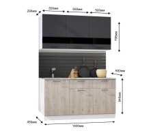 - три верхних шкафа по 500мм - общая ширина 1500мм. Высота 706мм. Глубина 290 мм.