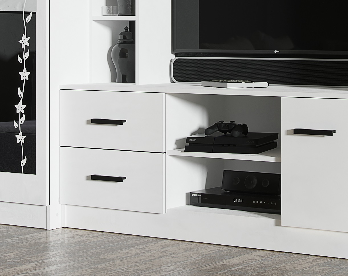 Средняя секция с нишей под ТВ размером 1000х800 мм с двумя выдвижными ящиками на роликовых направляющих и полочками.