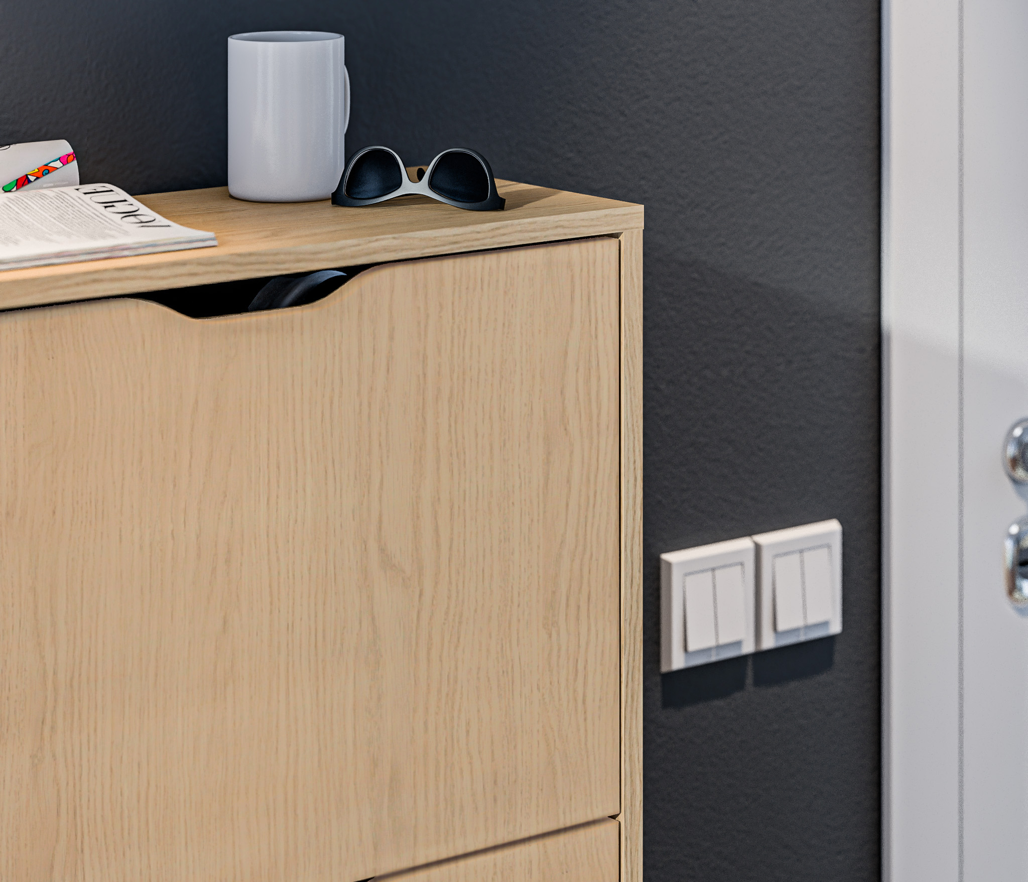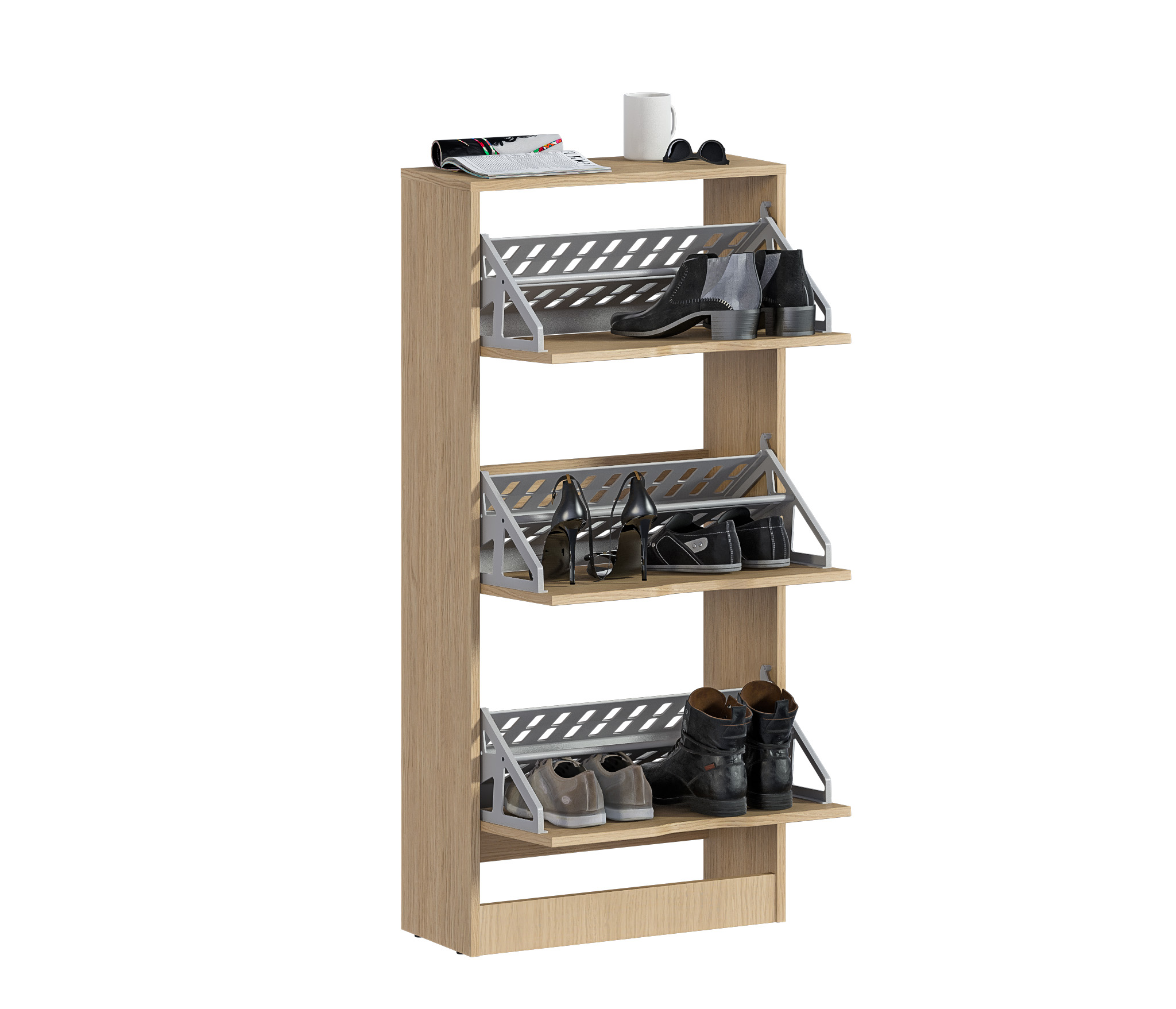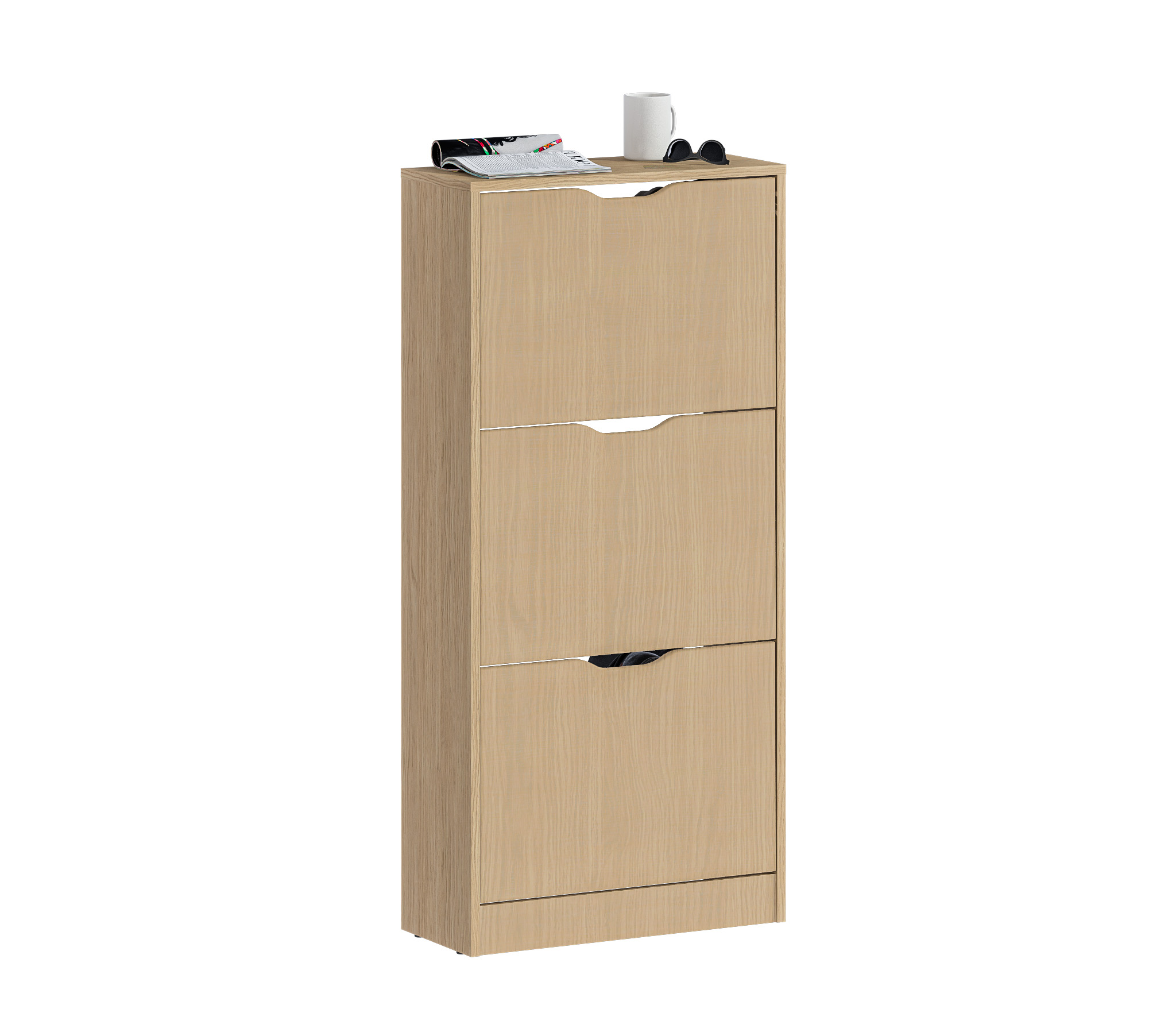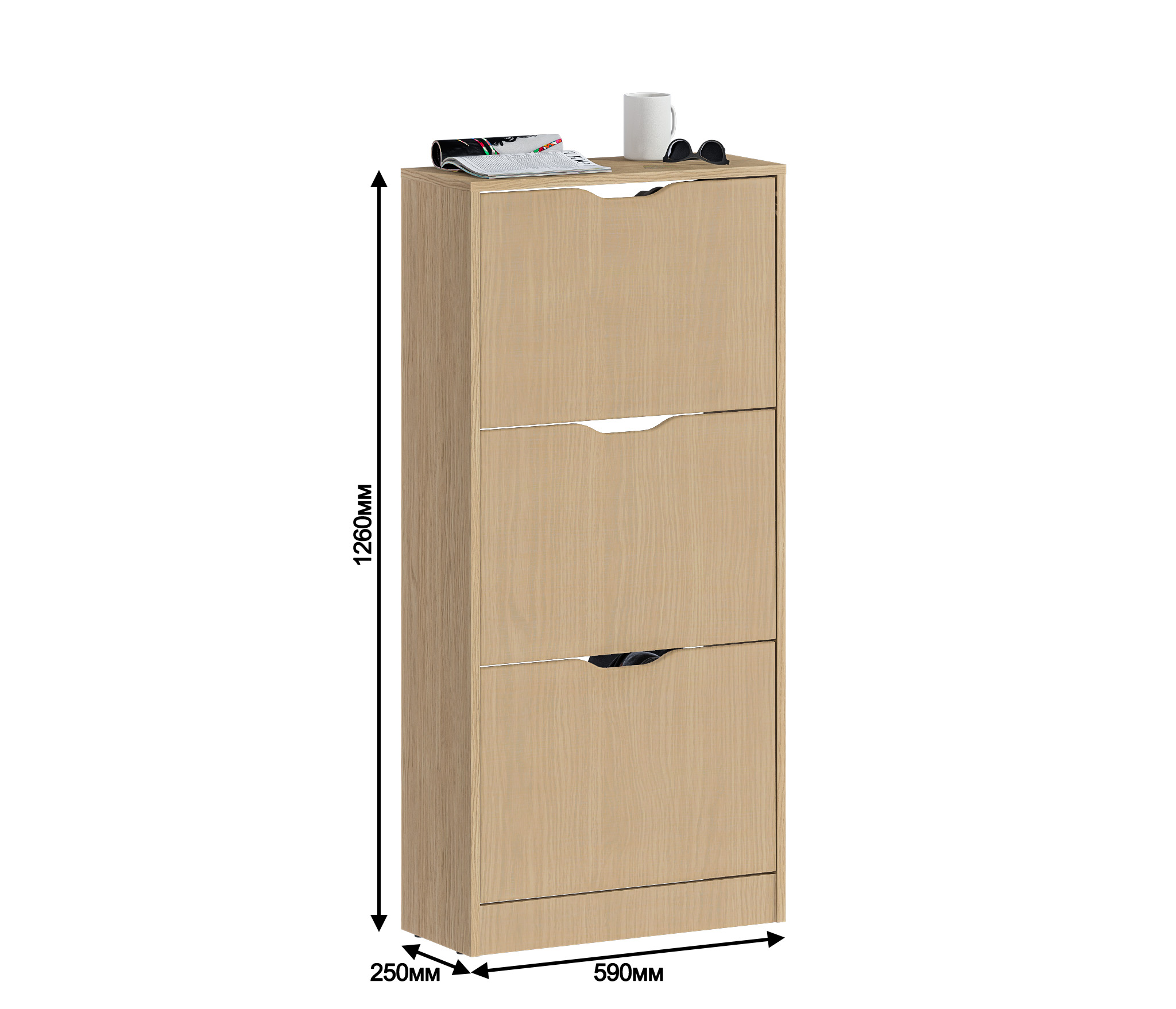 Габаритные размеры – ширина 59 см, высота 126 см и глубина 25 см. Обувница имеет три отделения, каждое из которых оснащено специальными стойками для хранения обуви. Прорезные ручки и строгие геометрические формы позволяют вписать обувницу в любой интерьер. Обувница произведена из экологичного прочного КДСП, устойчивого к мелким механическим повреждениям.