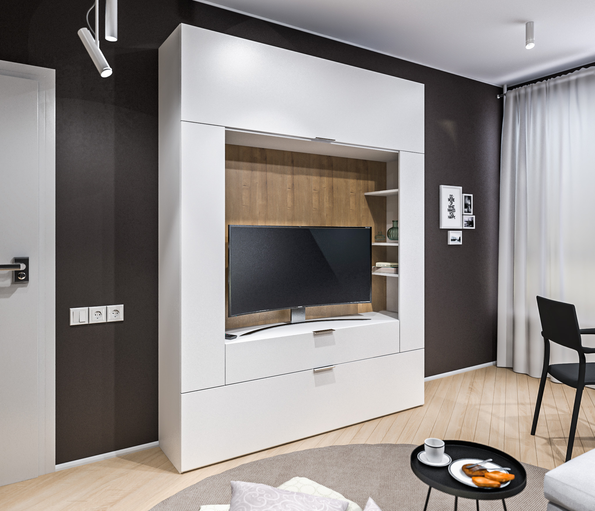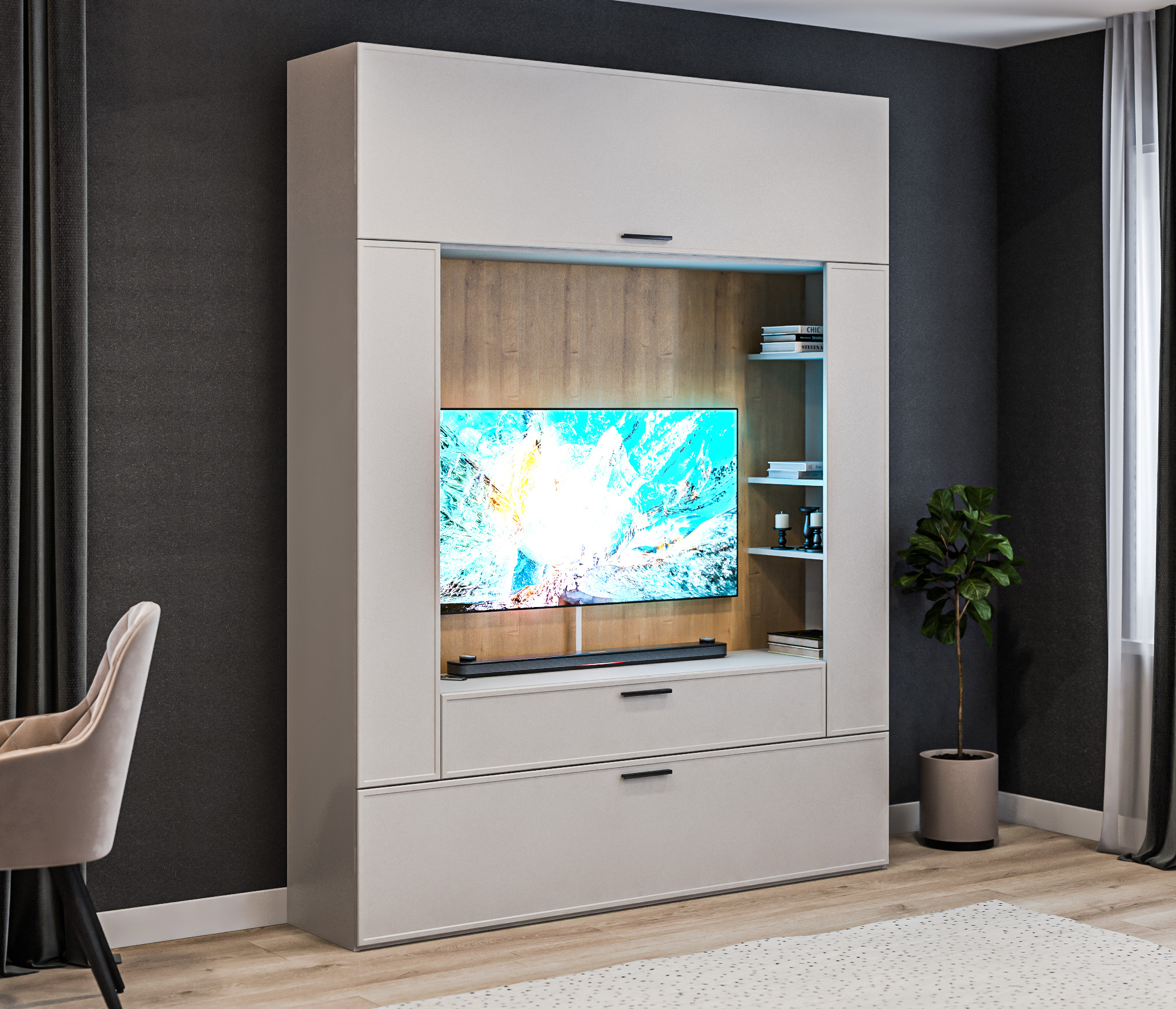 В состав стенки входит: тумба под телевизор с открытыми полками для видео, аудио аппаратуры и отделениями с непрозрачными дверцами, открытая полка для демонстрации коллекции декоративной посуды или памятных сувениров, закрытые модули для книг, посуды.