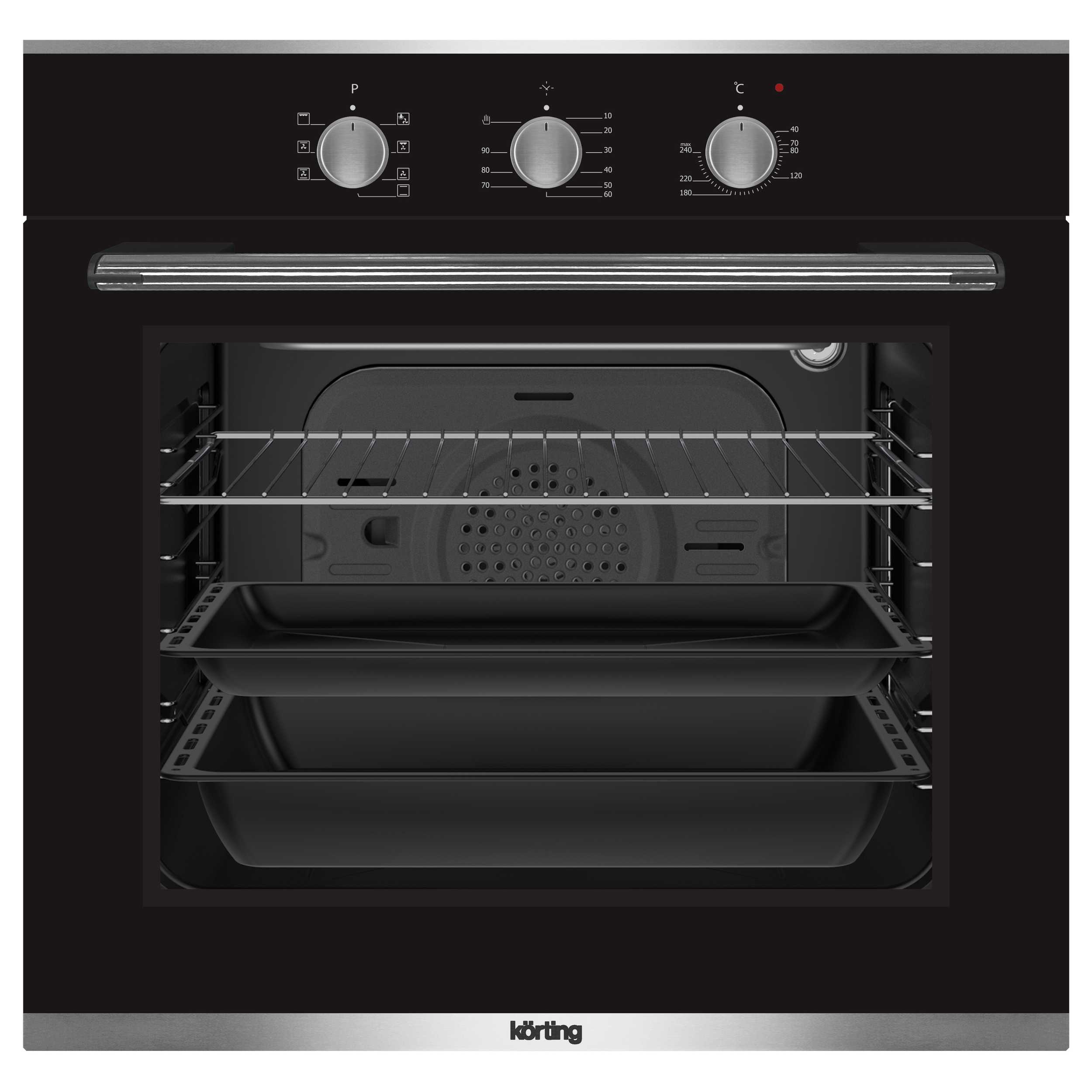 Духовой шкаф с механическим управлением, панель управления - стекло, утапливаемые регуляторы, 7 режимов работы, механический таймер с функцией окончания приготовления, двухслойное остекление, автоматическое отключение, каталитическая самоочистка, эмаль легкой очистки, в комплекте: глубокий противень, противень для выпечки и хромированная решетка.