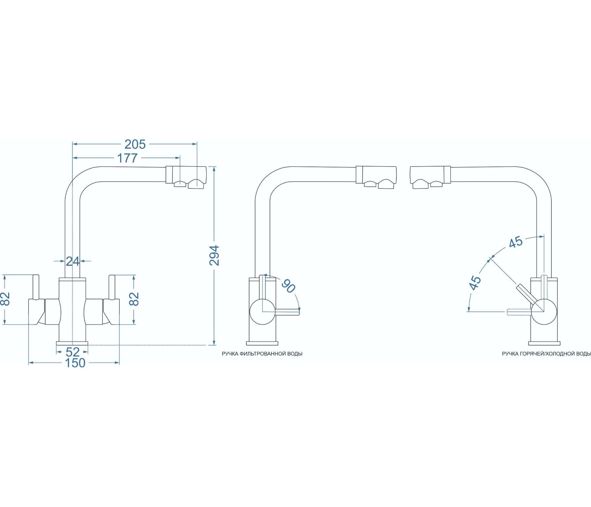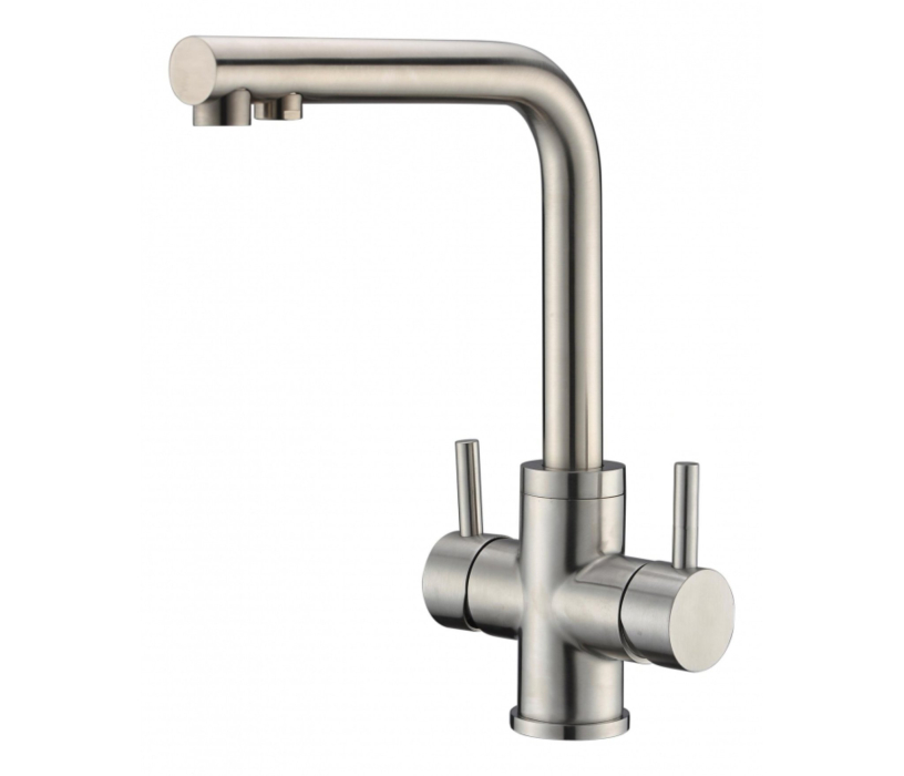 Смеситель обладает основной ручкой для подачи проточной воды и дополнительной ручкой для подачи воды из питьевого фильтра. Подключение к фильтру очистки воды стандартное.